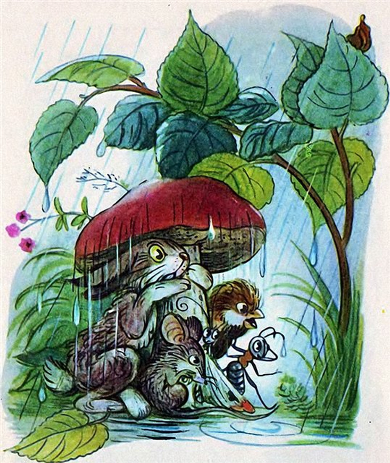 К тому времени дождик прошёл — солнышко выглянуло. Вылезли все из-под гриба — радуются. Муравей задумался и говорит: