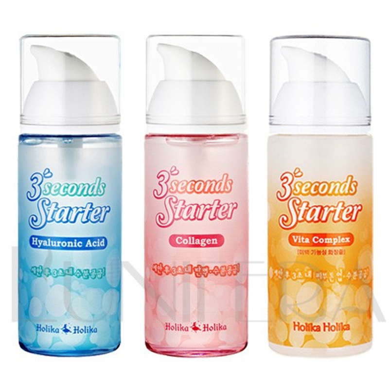 Ну и я тоже пользуюсь постоянно Holika Holika 3 seconds Starter - это и есть стартер, эссенция, которую надо на нести в течение 3 секунд после умывания. А можно не заморачиваться и просто не вытирать лицо полотенцем, на мокрое лицо спокойно наносить стартер. Этот стартер, а вернее гиалуроновая кислота в нем и занимается тем, что впитывают воду в кожу, действительно высыхает мгновенно. Увлажняет, смягчает и подготавливает кожу к следующим средствам. Благодаря гиалуронке очень мощный антивозрастной и увлажняющий эффект. Кроме него есть с коллагеном, писала Девочка, а еще недавно появился стартер с витаминным комплексом, оранжевый. Конечно, такие стартеры есть и у других фирм, просто у ХоликиХолики он признанно лучший у россииянок.