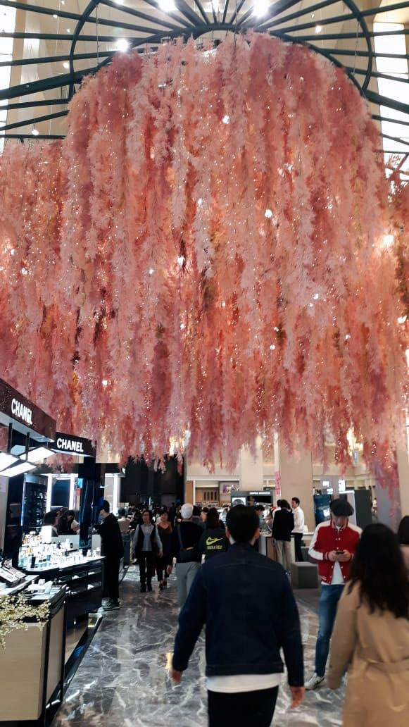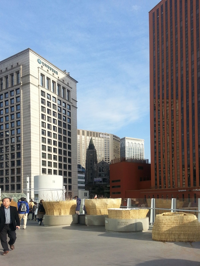 В Шинсеге, например, можно было написать желание на бумажном цветочке и повесить его на искусственное дерево, а можно и просто было полюбоваться вот на такую стилизованную инсталляцию…Желание писать я не стала, но пару цветочков взяла с собой. На счастье… И в общем, не шоперы мы, не шоперы…ну послонялись, что-то увидели… зато нашли выход на крышу и вот там было прекрасно. Пространство одновременно уютное, камерное, а с другой – открытое и наполненное воздухом и светом… летом там работают фонтаны, а пока вот так все…но даже так там очень мило и приятно…