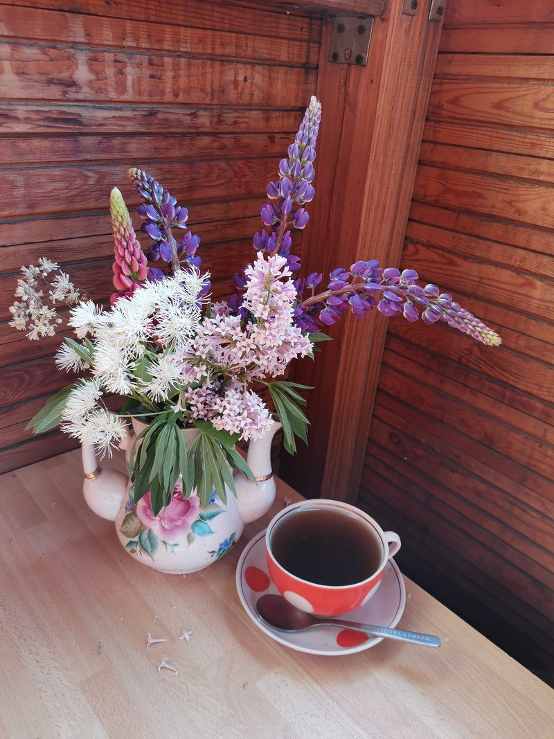 С сегодняшнего дня согласно моей дачной традиции и до поздней осени самоварбукет будет наливать по чайнику к столу на веранду и в беседку.