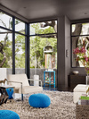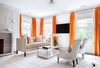 И штор не нужно.никаких.Если без коврика и без штор, то есть, имеем темно-серый пол и голое окно и огромную светло-серую софу и серые книжные шкафы - то куда цветное и что оно?