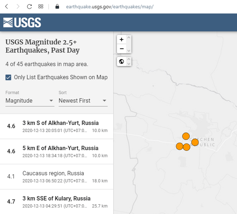 в воскресенье в 00:30 по Москве было зафиксировано землетрясение магнитудой 5,6 с эпицентром в Урус-Мартановском районе. Повторные толчки там же - в 14:30 с магнитудой 4,1, в 15:08 - 3,1, 16:05 - 3,8 и 16:36 - 2,9
