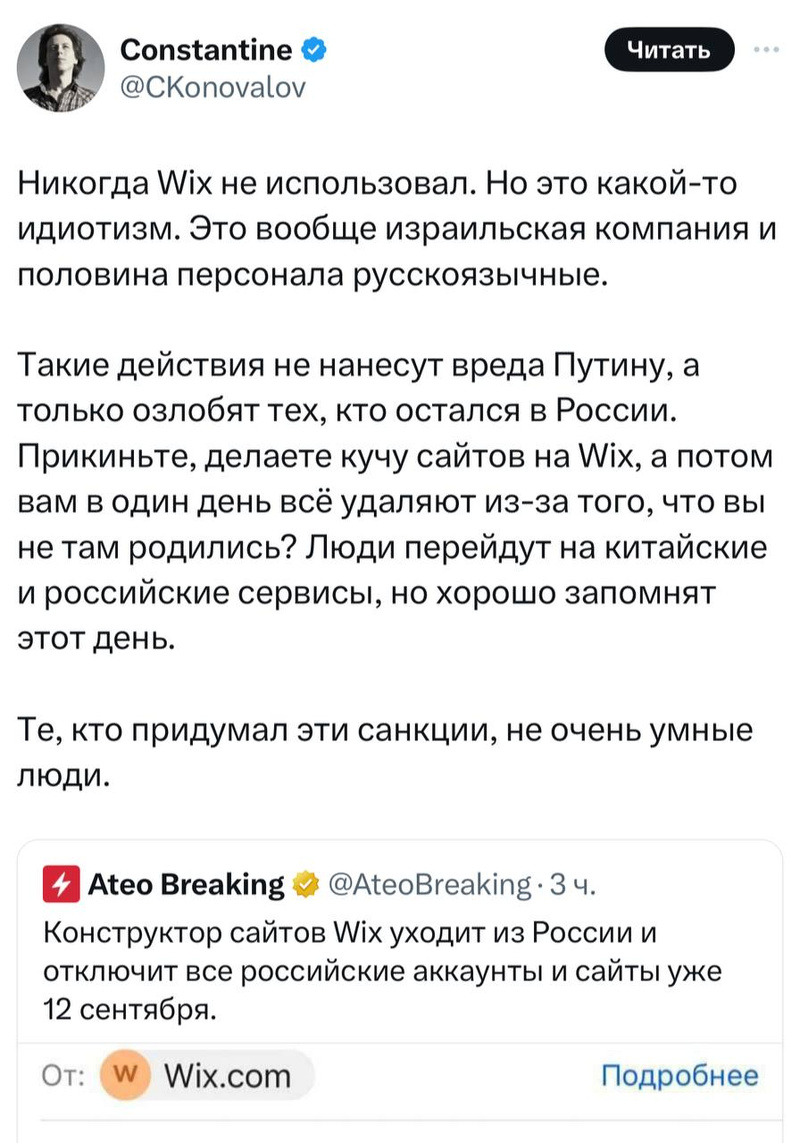 Конструктор сайтов Wix заблокирует аккаунты россиян 12 сентября 2024Такое впечатление, что вы прямо избирательно заостряете свое (и наше) внимание на контенте именно такого характера.... Зачем... Непонятно.
