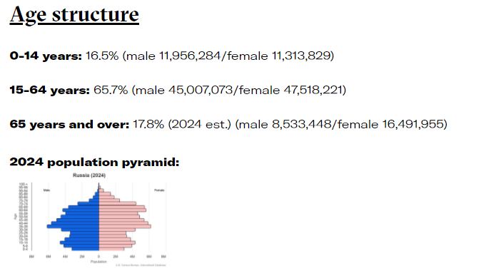 Насчет старших возрастных групп - в Москве 3,04 миллиона пенсионеров: 2,1 миллиона женщин и 967 тысяч мужчин.пенсионеры они разные бывают, в Москве огромное число военных и силовых пенсов, а они явно не 65 на пенсию выходят