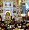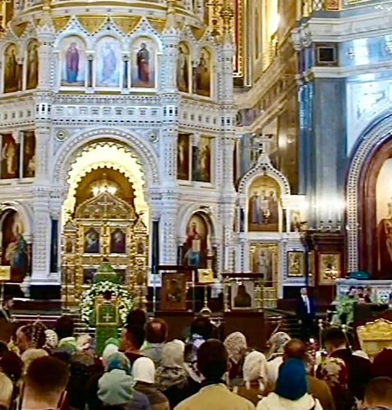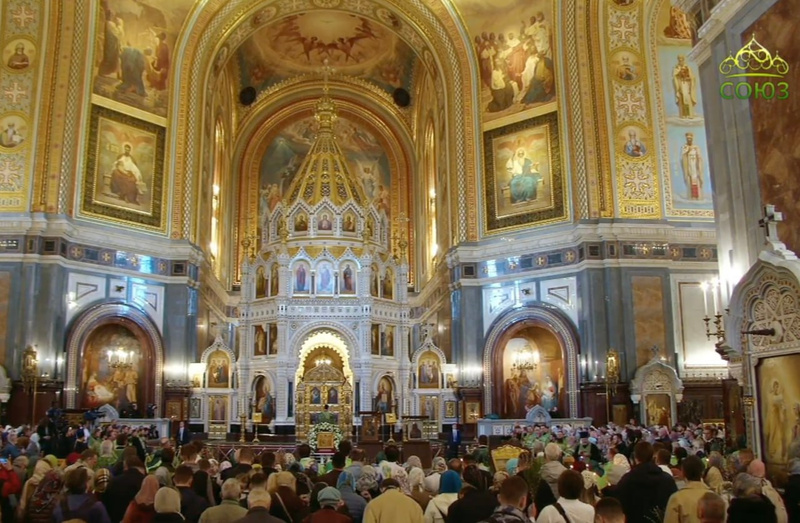 Пока пресс-служба патриархии не опубликовала фотографии, поэтому вот скриншоты из прямого эфира этого богослужения. Стоят две на том же месте, где уже стояла Троица Рублева.