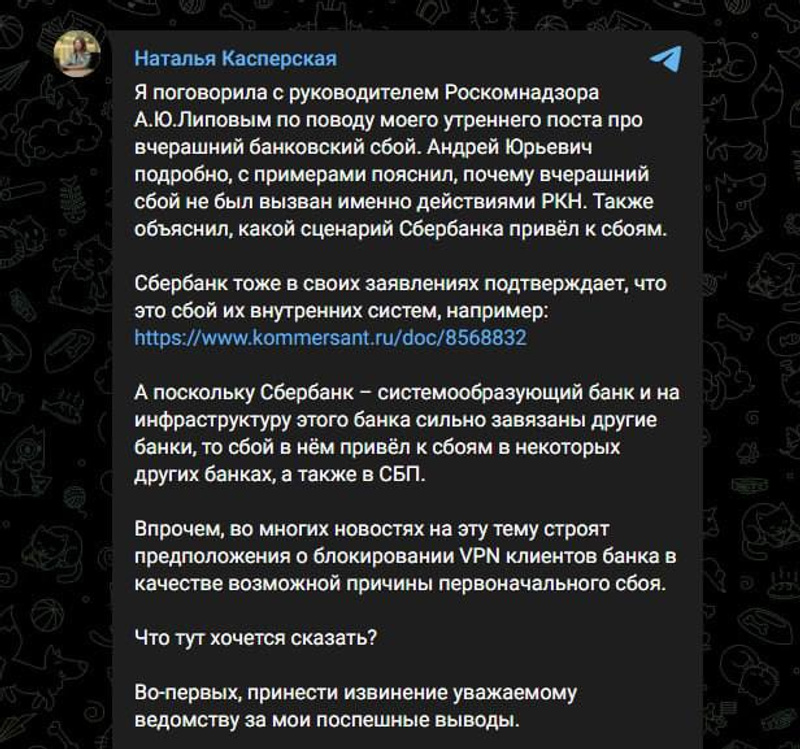 Я поговорила с руководителем Роскомнадзора А.Ю.Липовым по поводу моего утреннего поста про вчерашний банковский сбой. Андрей Юрьевич подробно, с примерами пояснил, почему вчерашний сбой не был вызван именно действиями РКН. Также объяснил, какой сценарий Сбербанка привёл к сбоям.