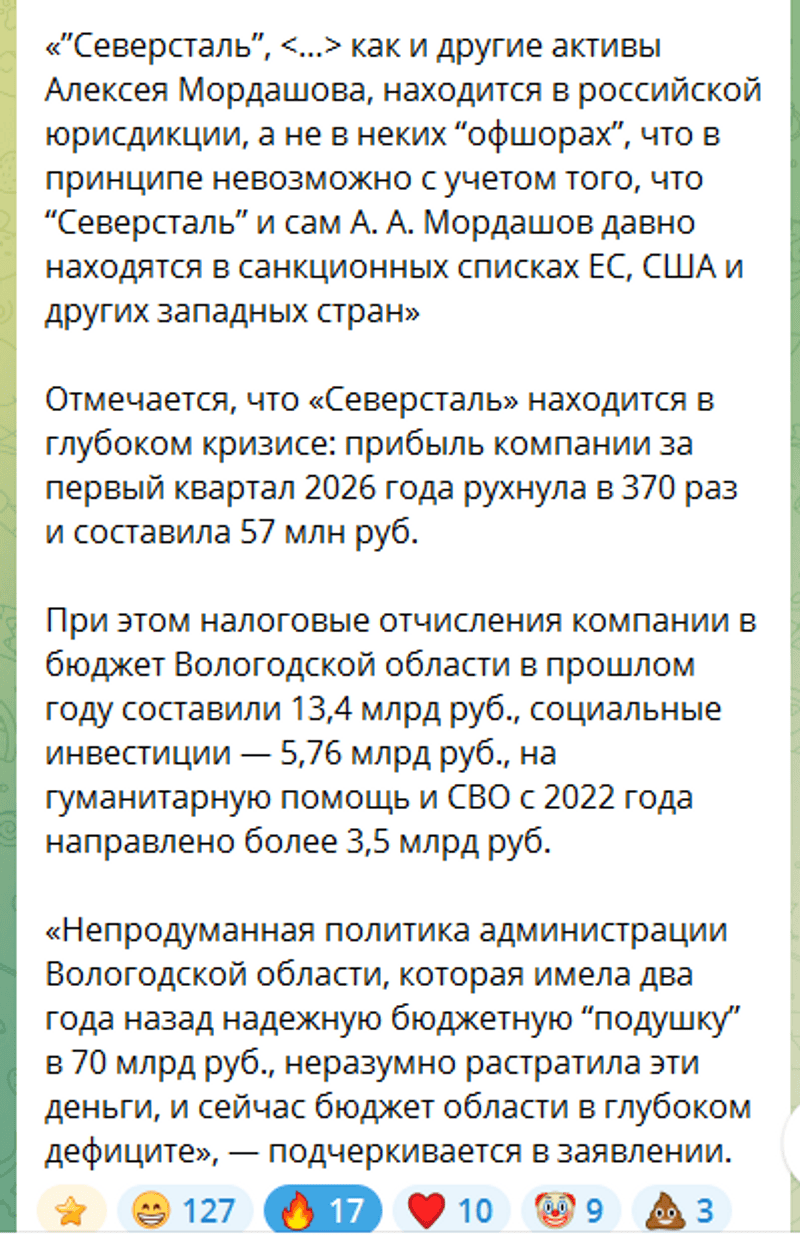 «Директор Череповецкого литейно-механического завода (ЧЛМЗ) Владимир Боглаев заявил, что в России сложилась опасная ситуация, власть оторвалась от реальности и не понимает масштабов экономической катастрофы. По его словам, страну ожидают серьёзные потрясения, сопоставимые с эпохой распада СССР»(с)с чего это он такой смелый?) это что ж должно произойти, чтобы не бояться такое заявлять)