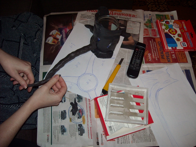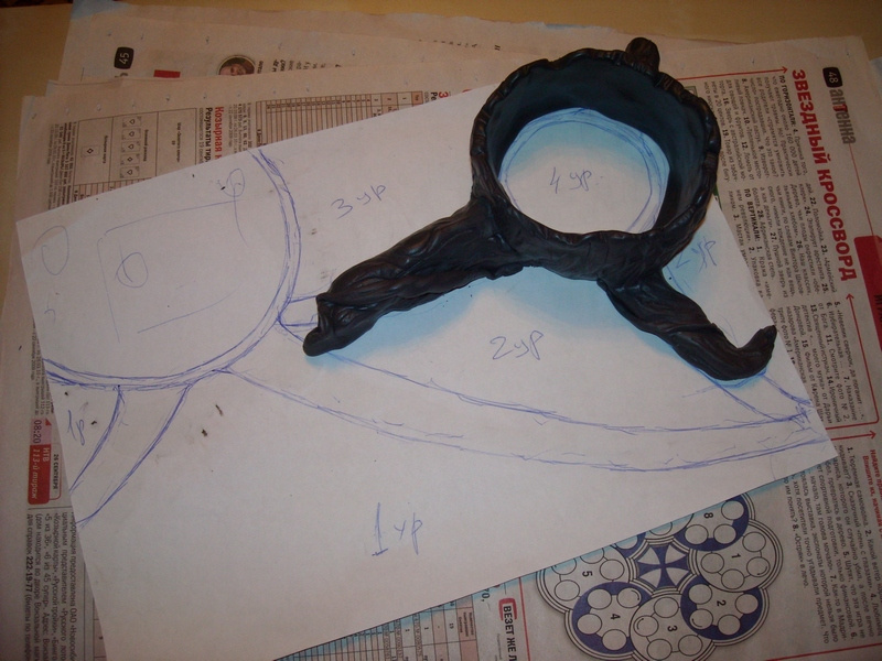 Очень удобно дно аквариума как раз под формат А4. Рисуем план и вперед лепить. Мое тут идея, план и физическая работа по разминанию пластики до легколепимого состояния. Сама лепка легла на хрупкие плечи жены.
