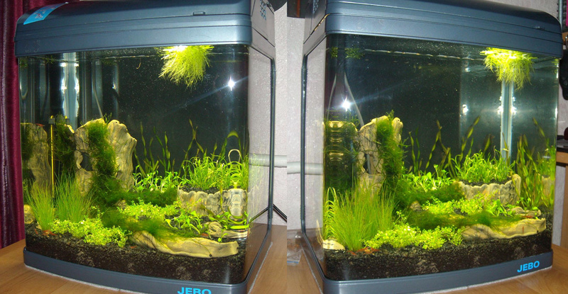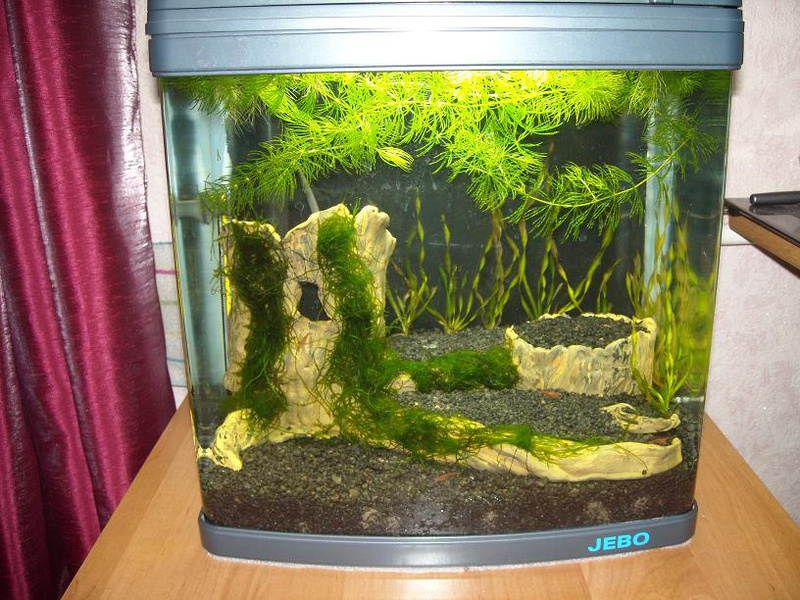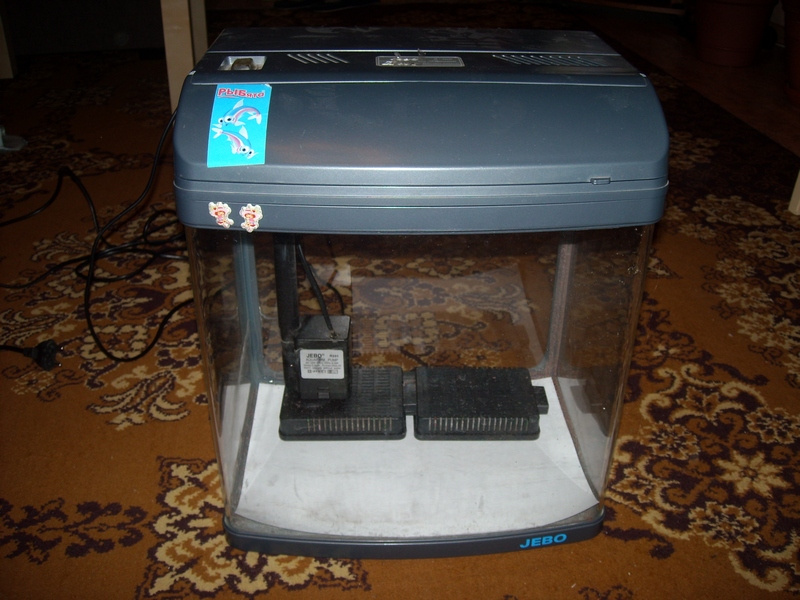 Фирменная банка JEBO. Водозаборник под грунтом, биофильтр в крышке, 20 литров, лампа Т5 8Вт. Чего сразу не понравилось? Помпа торчит ни к селу, ни к городу, да еще и блескучей, хорошо приклеенной этикеткой спереди. Ужос.Это к тому, что не нравятся мне инородные предметы в аквариуме, и если уж приходится чего-то помещать, то надо стараться спрятать.