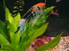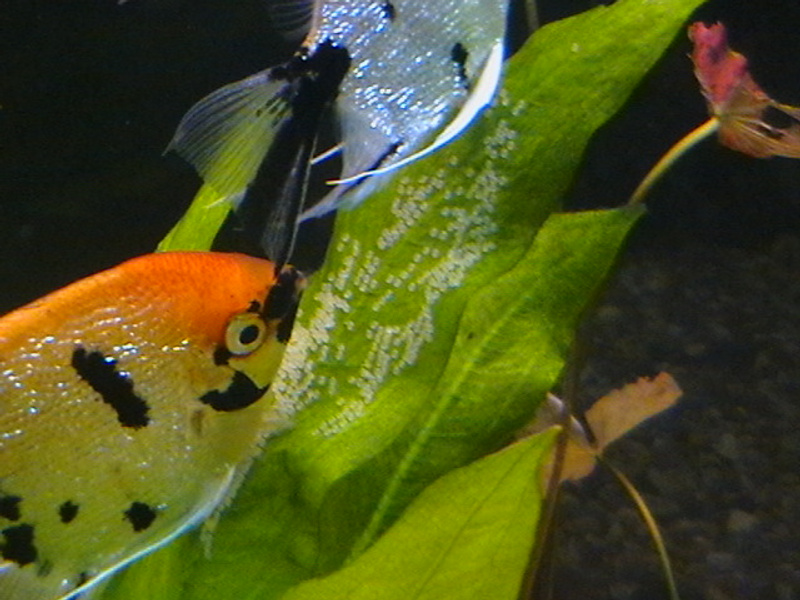 Ну вот!!! Полчаса после выключения света, захожу в комнату, торакатум, толстая скотина, ползает по этому листу и доедает остатки! А скалярки его не гоняют. То ли они его в темноте боятся, то ли панцирь его пробить не могут. В общем, маленьких скалярок в ближайшее время не будет!