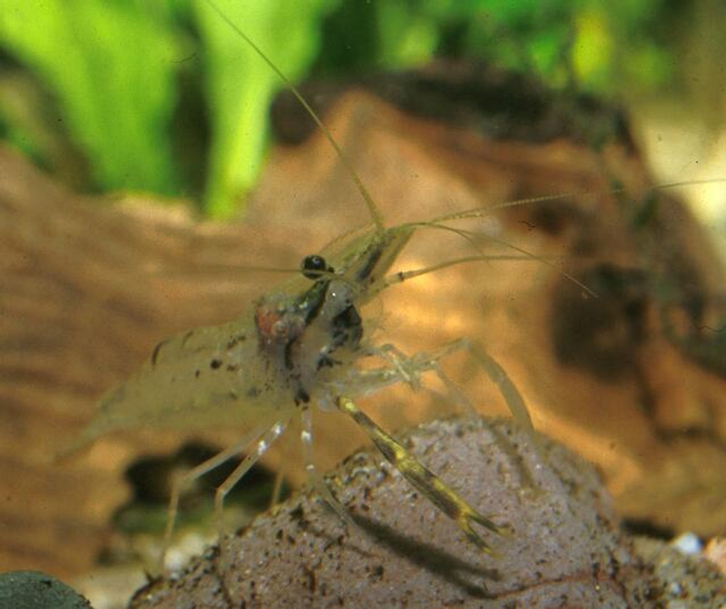 Индийская стеклянная креветка смотрятся в аквасе эффектно, крупные с красными клешнями.