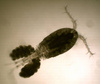 Сегодня утром включил свет и увидел на переднем стекле довольно приличное количество этих точек,поскольку они прыгали не так активно,удалось разглядеть их вооруженным взглядом - классический циклоп.