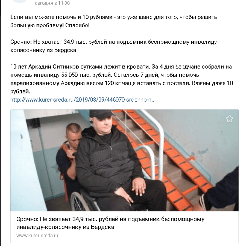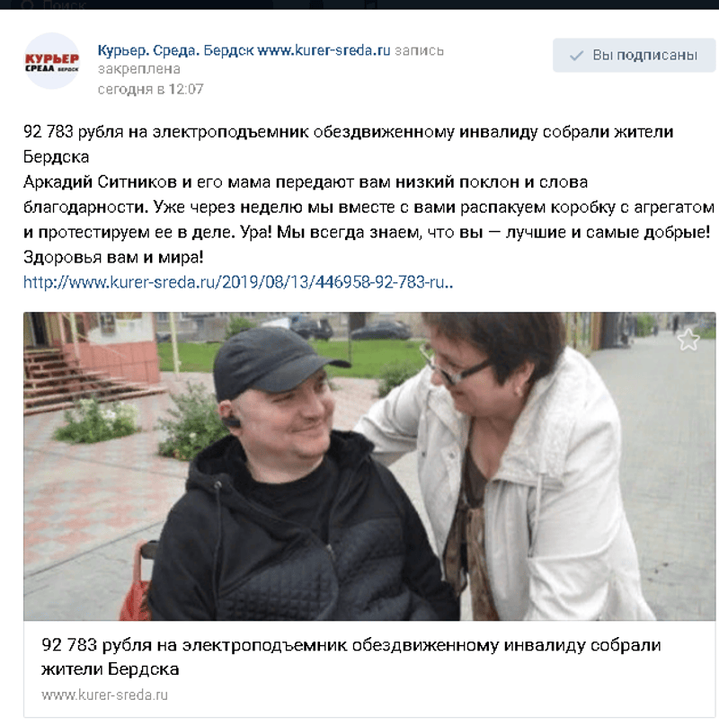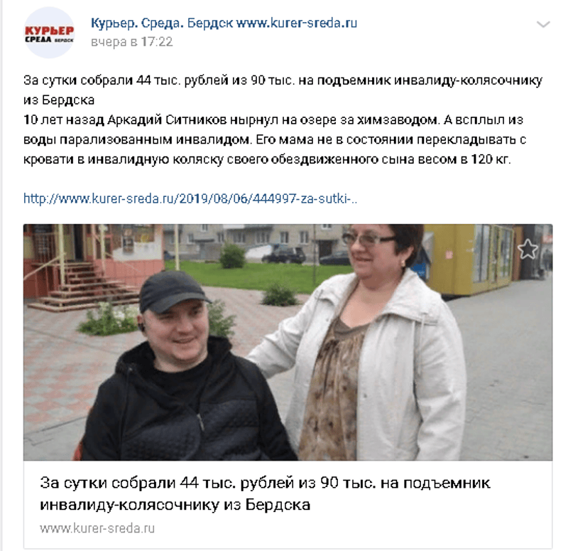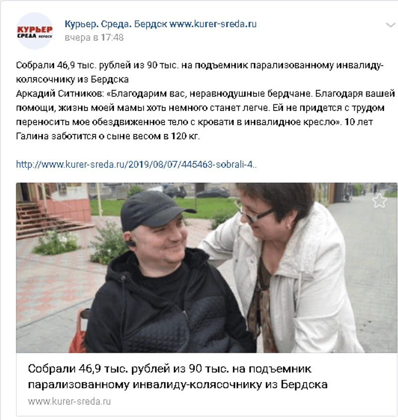 Добрый вечер.Сегодня у нас "знаменательная "дата, в этот день 14 лет назад наша жизнь разделилась на ДО и ПОСЛЕ.14 лет как Аркаша получил травму. Как мы выживали все это время это отдельная история. Но ясно одно, что без вашей помощи и вашей поддержки нам с сыном было бы совсем тяжко. Только благодаря неравнодушным людям мы смогли продержаться все эти 14 лет. Спасибо всем кто помогал нам в начале и помогает сегодня. У Аркадия на сегодняшний день дела мягко говоря не очень. Лечение особого результата не принесло. Что дальше делать, а главное на ЧТО? Не знаю как быть.Надомная работа вроде наклюнется, а потом пропадает. Голова уже квадратная от всей этой ситуации. Не смотря на свое состояние Аркаша по прежнему занимается общественной работой, скоро будет 4 года как он руководит организацией инвалидов колясочников Бердска.Сыну очень не просто все это дается, но он не сдается.