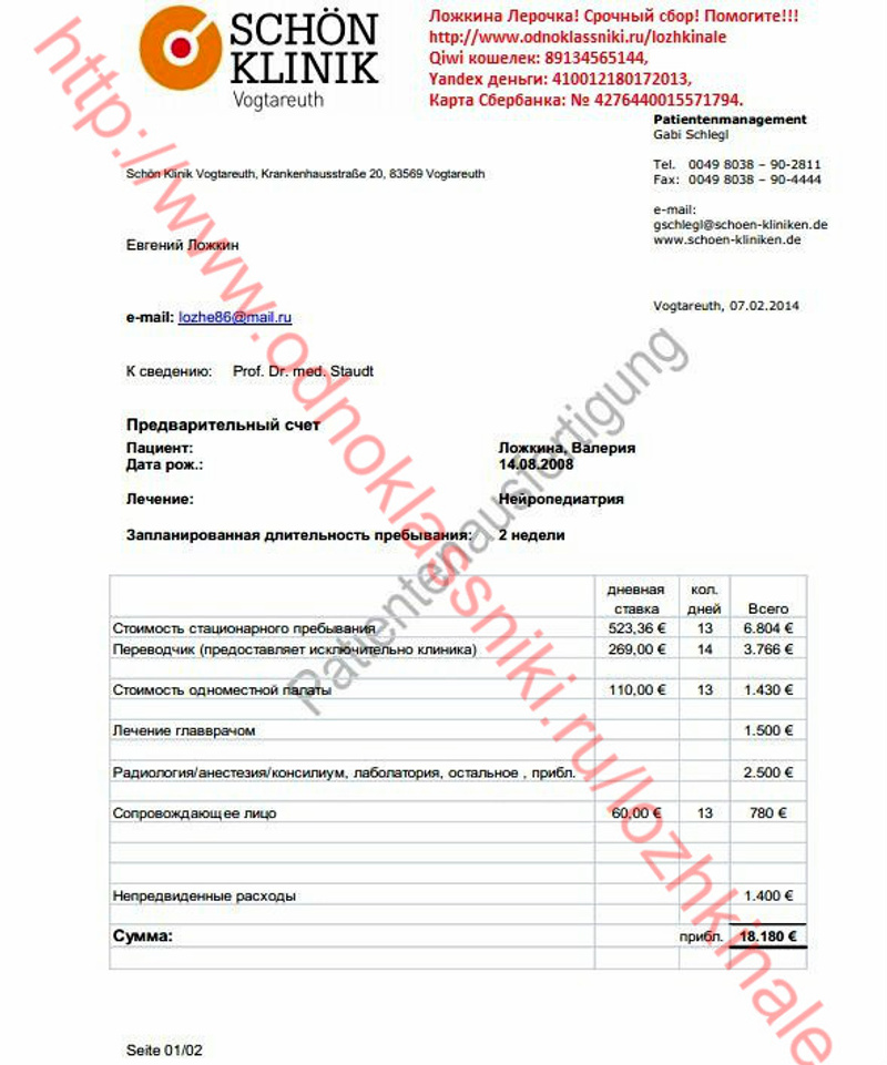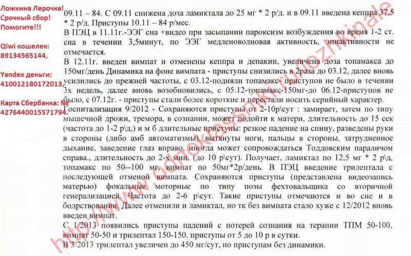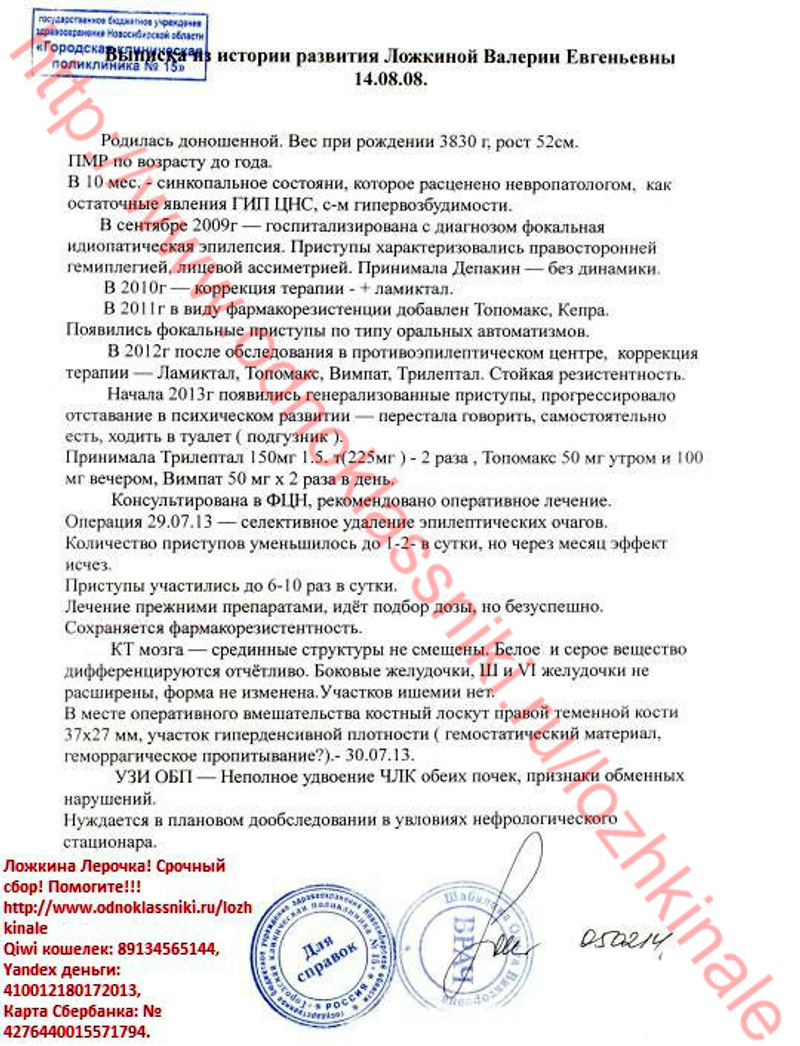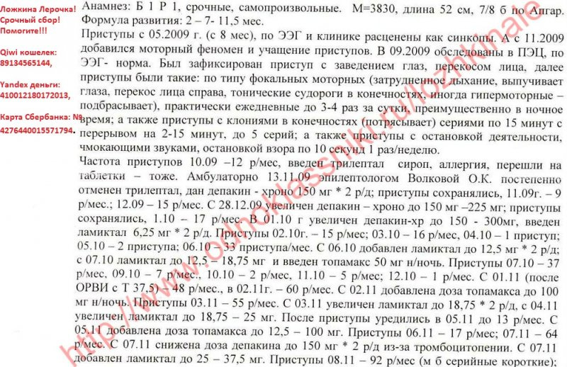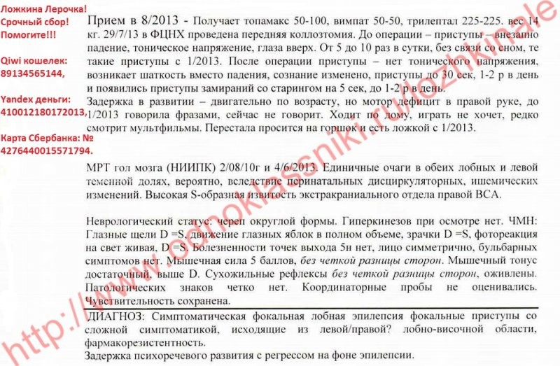 Здравствуйте! Я мама маленькой Лерочки! Хочу поделиться с Вами нашей страшной трагедией. На данный момент нам поставлен диагноз: Симптоматическая фокальная лобная эпилепсия фокальные приступы со сложной симптоматикой, исходящие из левой/правой? лобно-височной области. Фармакорезистентность. Задержка психоречевого развития с регрессом на фоне эпилепсии. Лерочка наша долгожданная, очень желанная девочка! Без нее мы не представляем жизни, она наш лучик света, солнышко, безграничное счастье!!! И просто думать страшно, и тем более видеть, как ее «пожирает» болезнь… Ничего нет хуже, чем видеть страдания своего ребенка! Её слезы… Смотреть в ее молящие о помощи глаза, и знать, что не можешь ей помочь, т.к. все упирается в эти злополучные деньги! Жизнь ребенка измеряется деньгами! Доченька родилась в срок, путем планового кесарево сечения, плод крупный и тазовое прилежание 9 месяцев. На пятые сутки, как и положено нас выписали домой. В 4 месяца пошли замирания, но диагноз никто не ставил. Лера развивалась по возрасту. В 9 месяцев потеряла сознание, и нас доставили в неврологию, взяли анализы, сделали ЭЭГ, но ничего не нашли, и нас отправили домой. А ближе к году начались страшные приступы с перекосом лица и провисанием правой стороны. Такого ужаса я не испытывала никогда!!! В "Синеглазке" нам поставили диагноз "Эпилепсия". Это был как гром среди ясного неба! Я даже в самом страшном сне не могла представить, что такое горе коснется мою семью. И после этого жизнь моей доченьки превратилась в настоящий кошмар! Постоянные обследования, коррекция терапии, плановая госпитализация 2 раза в год в неврологию. И с каждым годом Лере становилось все хуже. Приступы росли, учащались и видоизменялись. Доходило до 60 приступов в день. Постоянные обследования ЭЭГ результатов не давали. Мы делали 2 раза в 2011 и 2013 годах МРТ головного мозга в клинике Мешалкина, но и там ничего не нашли. С конца 2012 года пошли приступы с падениями и потерей сознания. В одном из таких приступов не успели подхватить дочь, и она при падении разбила голову, ездили в детскую травму на Красный проспект, наложили швы. После таких приступов дочь начала сильно отставать в развитии, буквально за считанные месяцы она перестала говорить, ходить на горшок, держать ложку, пошел дефицит моторики в правой руке. Можно сказать, что правая рука просто болталась, так как делать ей дочь ничего не могла. После этого мы обратились в Федеральный центр нейрохирургии. Там нам сделали операцию "передне-срединную каллезотомию", но, к сожалению, должного эффекта это не принесло. В первом месяце приступы начали уменьшаться в размерах и количестве, но через месяц все вернулось опять. На данный момент количество приступов доходит до 10 раз в сутки, мы не говорим, не держим ложку, не просимся на горшок. Опять коррекция терапия, но эффекта нет. Наши врачи разводят руками. На российском оборудовании не видно эпилептический очаг. А если его удалить, то по прогнозу врачей, ребенок полностью восстановится. В России шансов нет…. По настоянию нашего лечащего врача-эпелептолога к.м.н. Волкова И.В.** обратились за помощью в Германию. В клинике Schon Klinik Vogtareuth нам выставили счет на обследование 18180 евро. Эта клиника специализируется на неврологических проблемах, в т.ч. на эпилепсии. Там очень мощное оборудование – мозг виден, «как на ладони