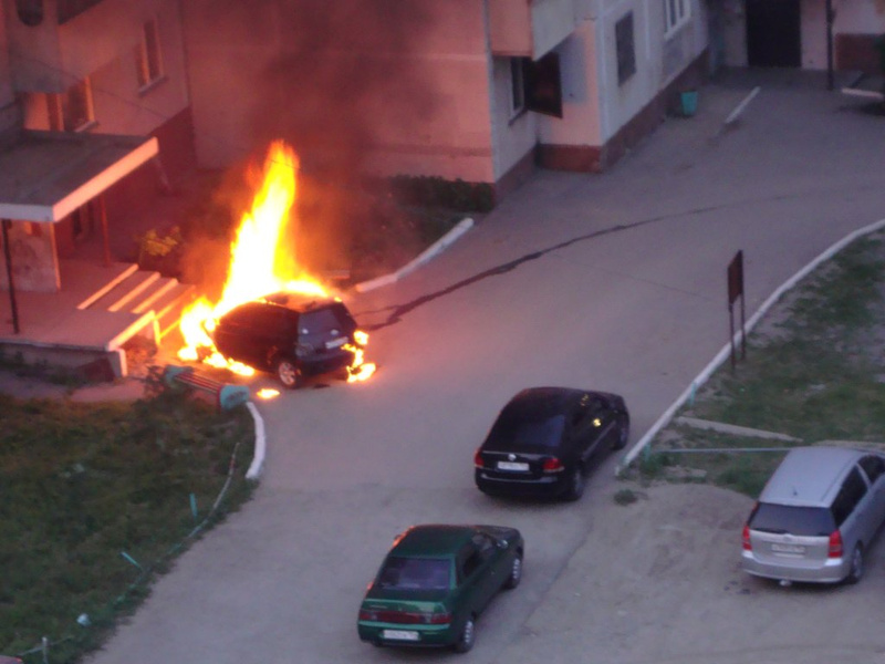 Сегодня 28 июня в 4.10 опять сквозь сон взрыв сначала один потом второй, думаю не ужели пять, встаю и опять таже картина я в шоке горит еще одна машина с другой стороны дома. Пожарные приехали быстро. Сегодня сгорел только перед машины. Приехали полиция и дежурная часть. Начали по-видиму опрашивать людей, хозяева машины писали заявления. Но обнаружилась еще одна машина, которая стояла около 3 подъезда облитая какой-то жидкостью, эта жидкость похоже воспламенилась но потухла. Машина была покрыта белым налетом. Поэтому взялись за другую машину и подожгли.
