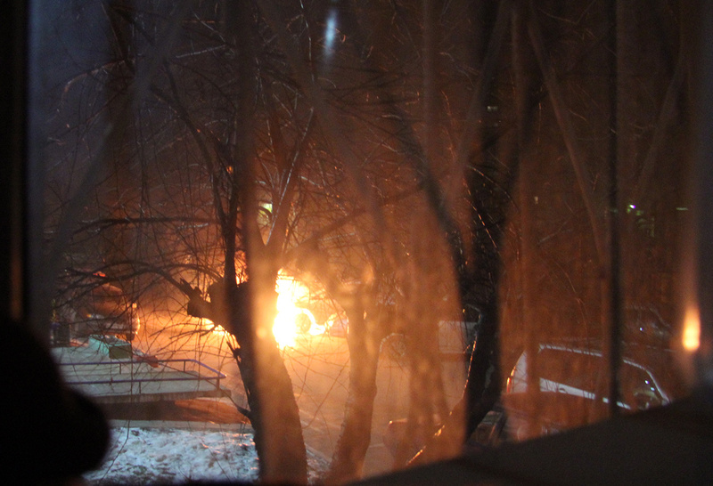 Вдруг за окном хлопок и весь двор озаряется характерным светом открытого огня, слышно как заводится двигатель. Хватаю фотик (каюсь, грешен) и на балкон глянуть, что случилось - горит машина, работает (мне так показалось, что это она же запустилась). Я за телефон сначала под руку попался сотовый - 01 не понимает (как кстати с сотового звонить пожарным ? ), потом за домашним, не успел договорить адрес, девушка перебивает - уже едем - кто-то уже успел сообщить.