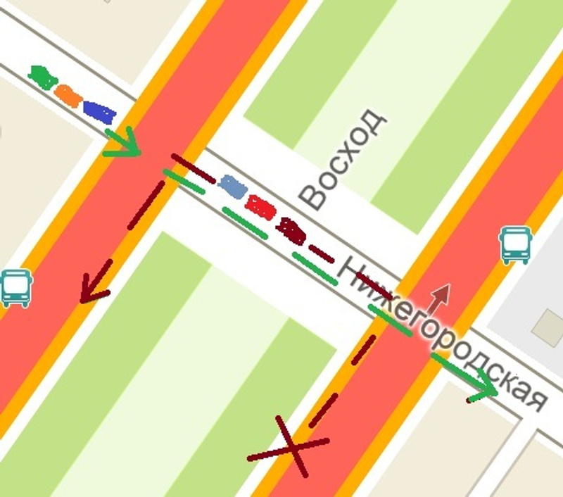 Или Вы предлагаете все же водителям со стороны Сакко догадываться кто с разворота с Восхода, а кто с Нижегородской?