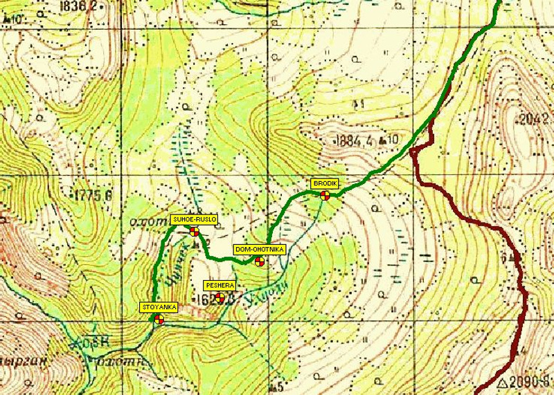 а вот это где такое сухое русло? вообще, хотелось бы увидеть реально пройденный маршрут на карте.Вход и выход речки из под земли я не видел, но сухое русло это и есть "чунчек"(а может "чуячек" по карте не могу разобрать) 12 июня он был абсолютно сухим маленьким руслом, мы проезжали его дважды. После дождя в русле текла настоящая река, глубиной до 40 см и это всего лишь после 12 часового дождя. Бродик который мы проезжали это речка "Улуоди", там где эти речки сливаются и окончился наш путь, бийская нива сломалась... бурная речка это тоже "Улуоди" в ней 12 были видны крупные валуны, а 13 все они были скрыты высокой водой. Пещеру сфотографировали толи за домом охотника, толи чуть дальше(на карте я указал примерно). В домике охотника живёт местный парень, зовут Михаил, живёт там уже много лет и впринципе всё о той местности должен знать, если туда направитесь можете распросить его. В следующую поездку мы пойдём уже в сторону Альбагана через Ашпагачский голец примерно в начале - середине августа.