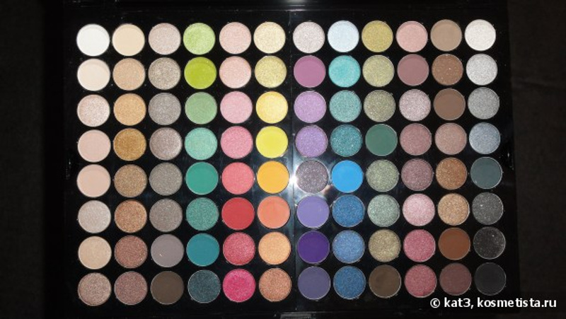 Во! У меня тоже две таких палетки - одна натуральных оттенков на 80 цветов, вторая разноцветная-кислотная на 80. Просто замечательные тени! Выдерживают целый день, прекрасно растушевываются. Кислотные оттенки в умелых руках приобретают вполне потребный вид на глазах, особенно если их наносить точечно в качестве бликов. В общем, восторгу предела нет. =)