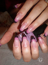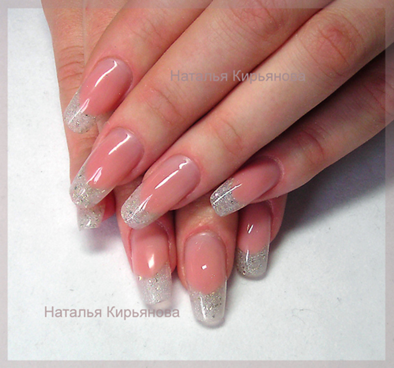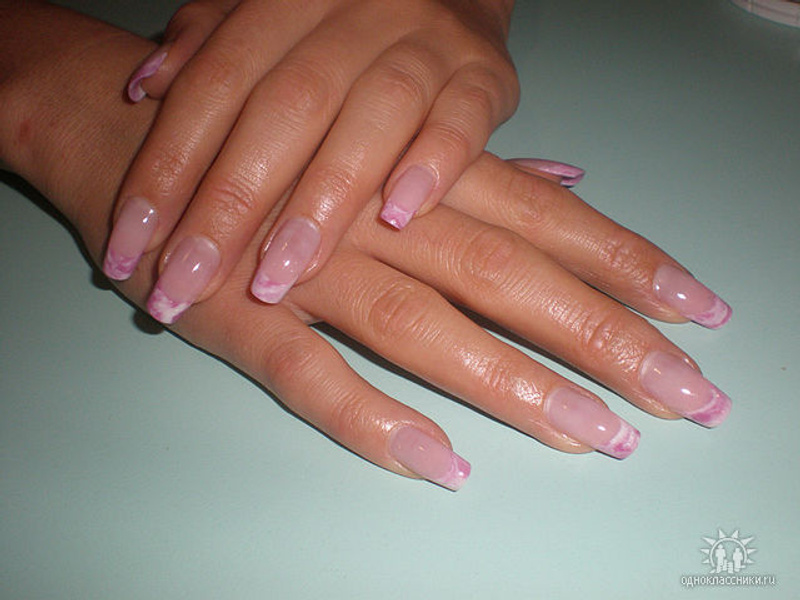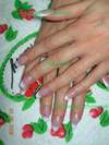Вот еще!Не хочу показаться злобствующей занудой, но в акриле большой выбор оттенков камуфлирующих пудр, в отличии от геля, и мне кажется, что при выполнении вот этого наращивания Вы использовали не совсем тот оттенок...![]()