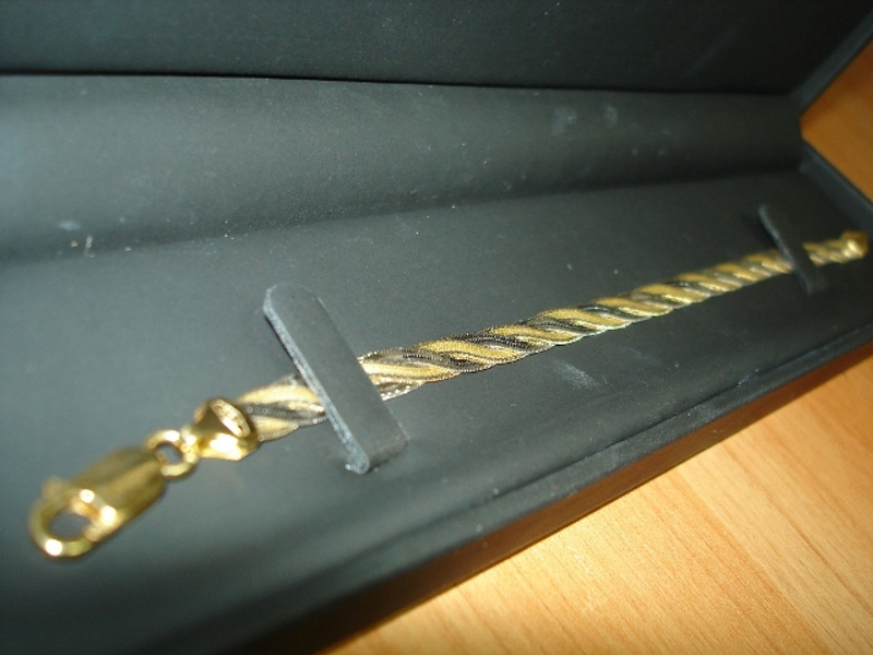 Продаю браслетик из белого и желтого золота, 750 проба, 7.52 грамма, длина 19 см., толщина цепи 0,6 см. Привезена из Эмиратов, ювелир сказал, что производство Италия (как определила не знаю). Браслет новый совершенно ни разу никем не ношенный. Прощу 16 000 руб.Италия вряд ли к этому браслету имеет отношение. К тому же такого плетения полным-полно браслетов 585 пробы. Стоимостью от 2500-8000.