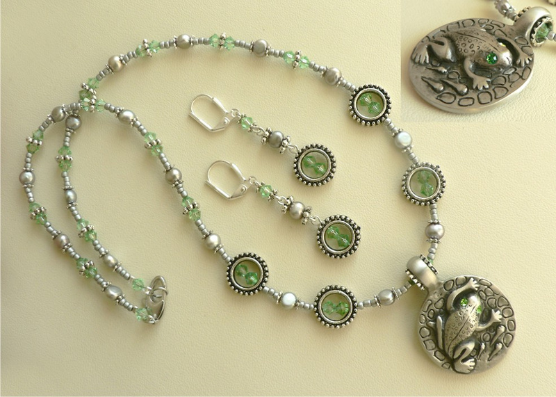 В ответ на: Кристаллы Сваровски, речной жемчуг и бисер цвета "металлик", металлофурнитура под черненое серебро, ювелирный тросик. Серьги на посеребренных швензах. Длина колье по шнуру -46 см. Размер подвески около 3 см. Лягушечка волшебная - листочек и тушка объемные, глазки сияют в окружении Сваровски. Посидит на листочке, посверкает глазом и ускачет по своим таинственным делам))))).