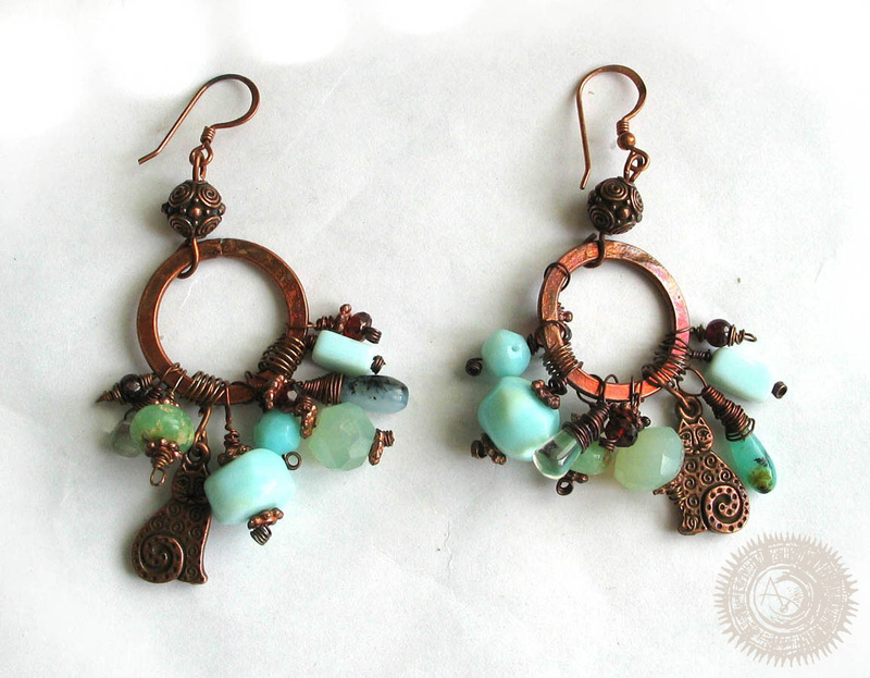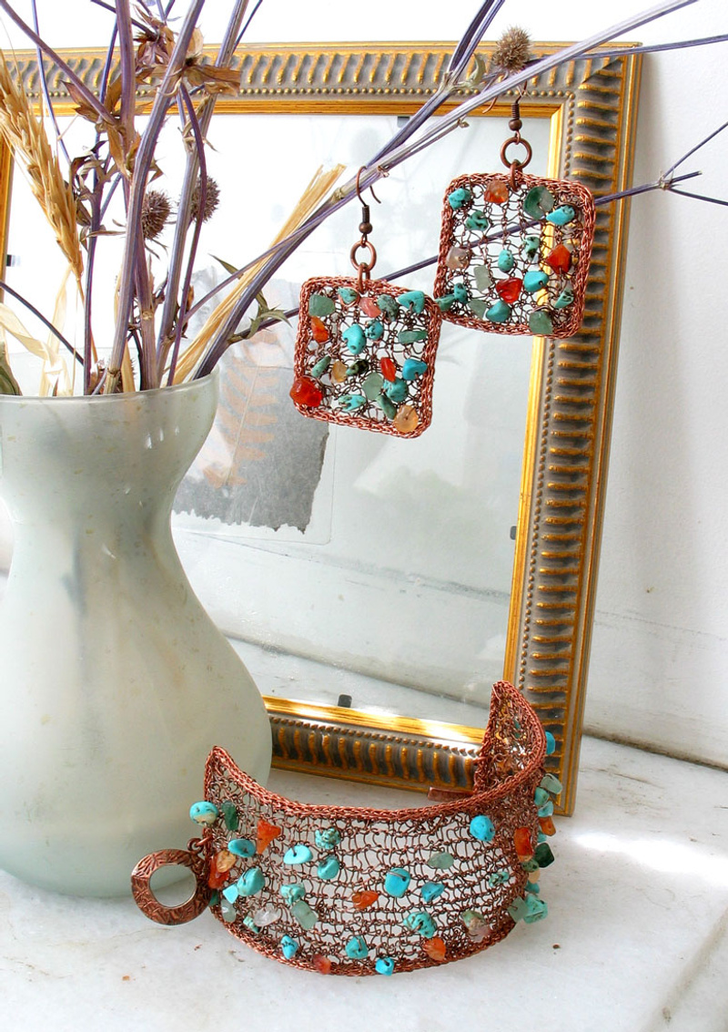 ручная работа. медь, сердолик, нефрит, говлит под бирюзу. длина застегнутого браслета 19см (можно удлиннить) 1100 р.бонус к браслету - серьги . Длина от швензы 4,5 см, ширина 3,7 см