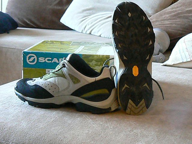 СРОЧНО продам треккинговые кроссовки (не ботинки) SCARPA EGO LADY размер 39, но я ношу 38.5 мне они как раз. Особенно с хорошим носком, куплены в магазине "Снежный лис" три дня назад за 4500 рублей (цена уже со скидкой, ранее стоили 5500р). поносила их эти три дня и поняла, что это все таки не то, что мне надо. Мне надо голяшку повыше. К сожалению, в магазин сдать их уже не могу, так как все-таки я их носила по улице. Хорошие, добротные кроссовки известной фирмы, сделаны в Румынии (если кому это важно), прекрасно подойдут и для похода и просто для города. Очень удобные. Так как мне их нужно срочно продать, чтобы успеть купить себе что-то другое, то цена - 3500 рублей. Это просто подарок для таких кроссовок, характеристики на них можно поискать в инете. Предложение действительно до 19 -20 июля, потом все-таки поеду в них, так как две пары себе позволить не смогу:( Фото.
