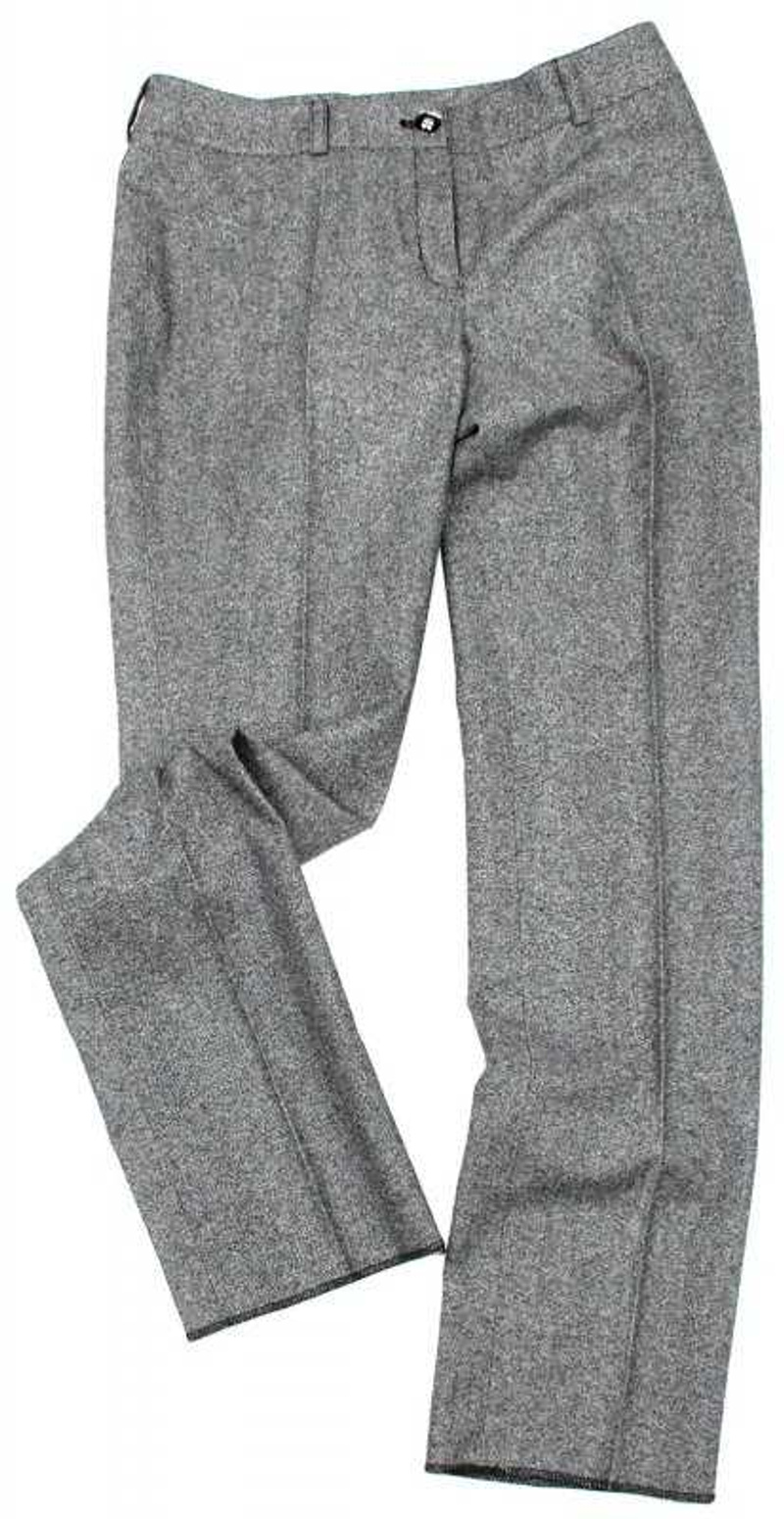 Ткань (80 шерсть, 20 пэ) с добавлением нитки люрекса - цвет серебристый, легкий отблеск, не пошлый, в общем нескучная классика! На размер 44-46 (170-88-96), при росте выше 170 носить можно будет только с обувью без каблука. Длина брюк по внешнему боковому шву 105см, по внутреннему 84см, талия занижена сантима на 3-5, брючины немного заужены книзу. Причина продажи - мне безнадежно большие
