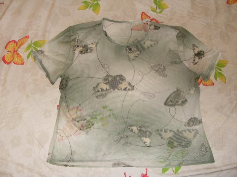 2. Кофточка-сеточка с коротким рукавом. Шилась на заказ. Состояние отл. Цвет зелёный с белым. Рисунок - бабочки. Размер 42-44. Длина 49 см. Цена 250 р.