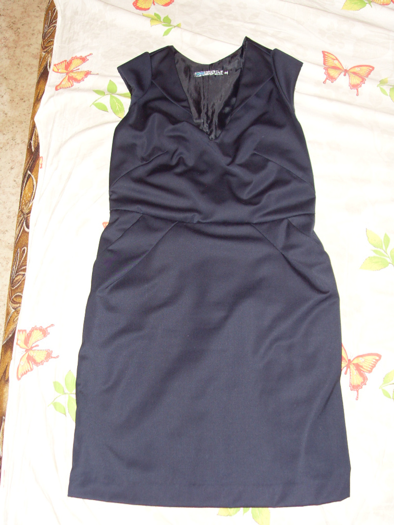 4. Маленькое чёрное платье Be Free. Форма - футляр. Состояние хор. По бокам карманы. Сбоку замочек, сзади внизу разрез. Платье тёплое, с подкладом. Длина по спинке 88 см. Размер 42-44. Цена 500 р.