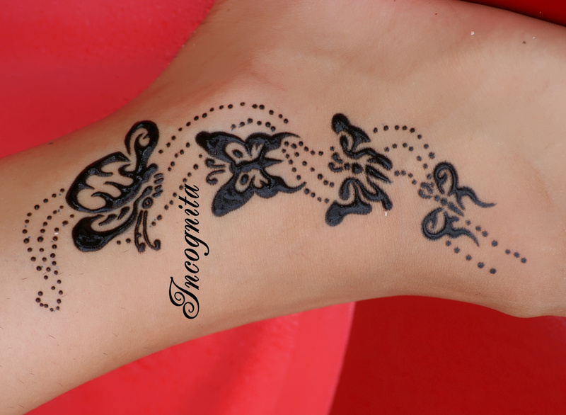 вот на моей ноге, правда несмытый только что нанесенный слой, но после смывания рисунок был очень ярким