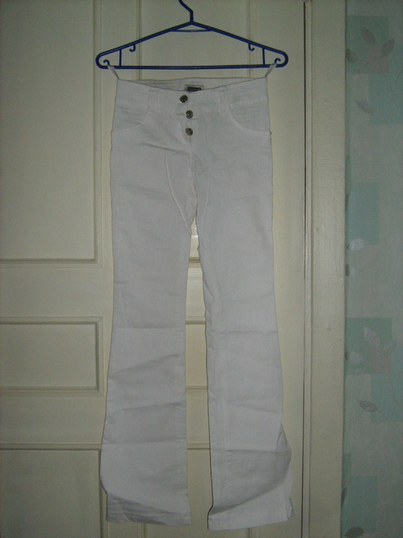 Продам брюки белые , (лен и эластан), на 42-44 размер. Низкая посадка, в бедрах около 88 максимум 90 сядет. Б/у 1 раз, требуют стирки.