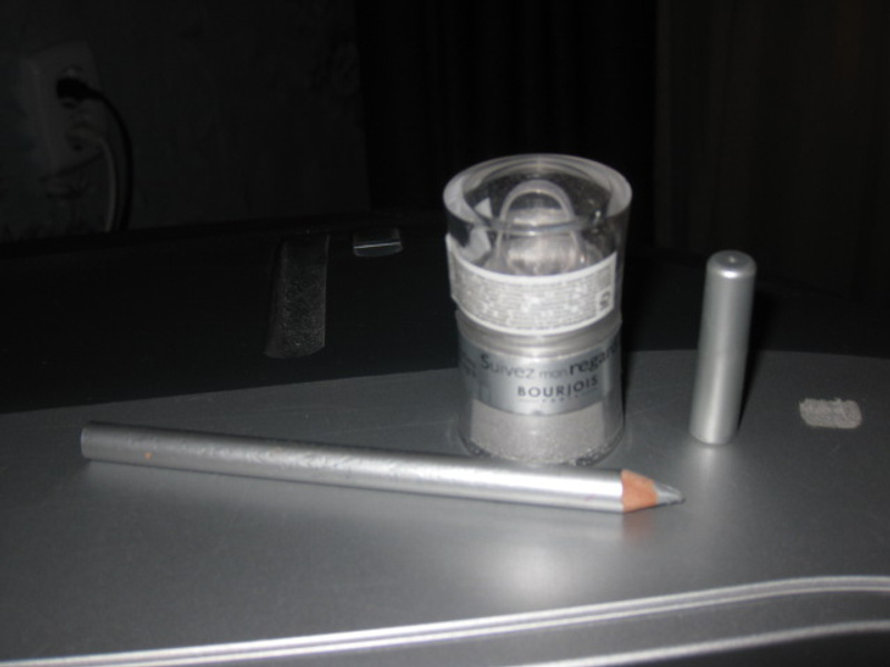 серебристый карандашик для глаз и серебристые рассыпчатые тени Буржуа (с кисточкой) - 100р за комплект. Тени использованы пару раз, карандаш юзан поболее.