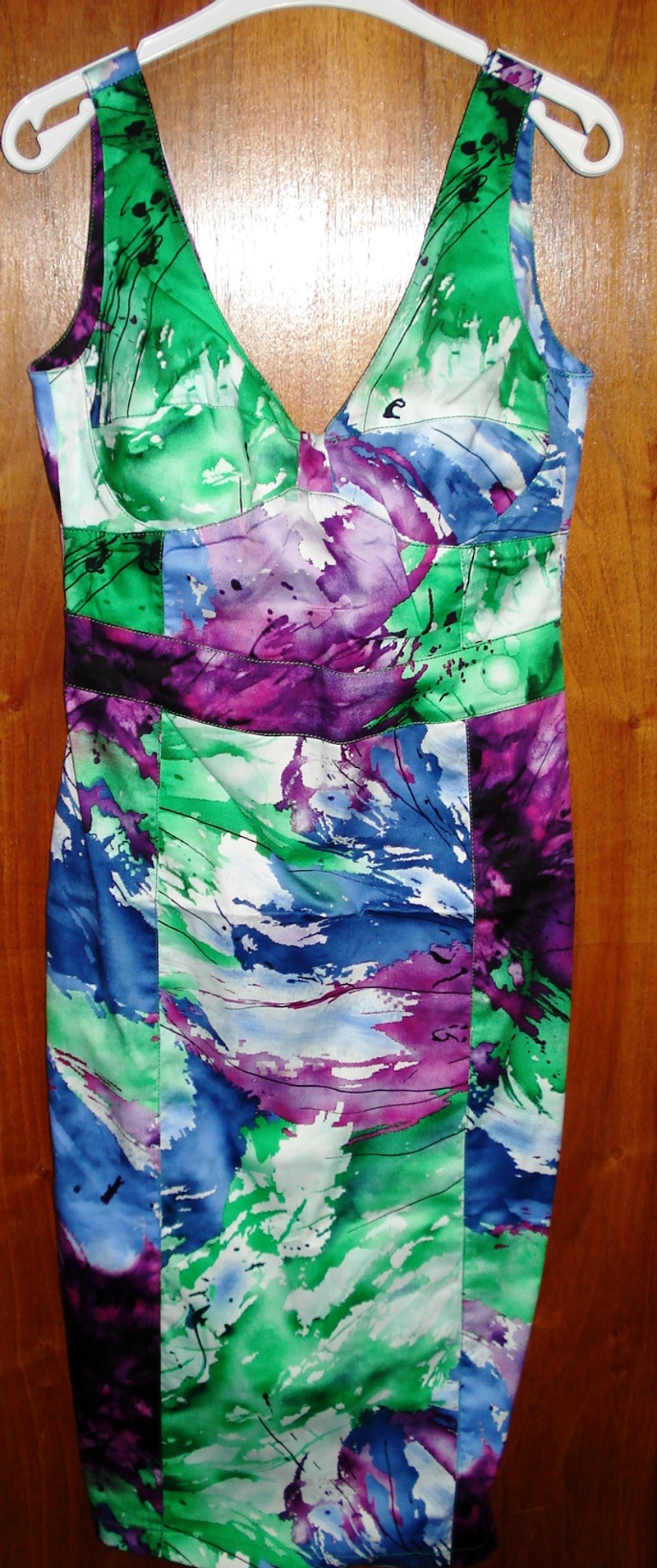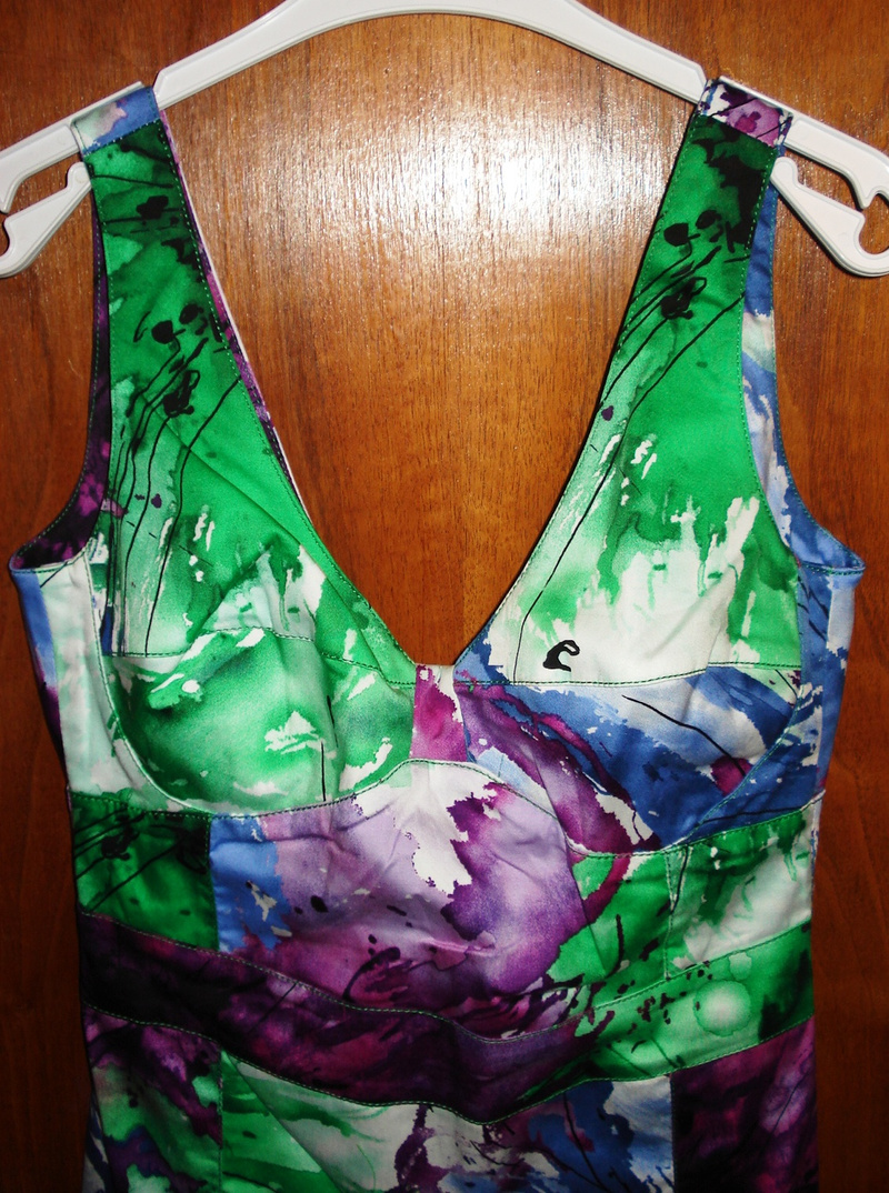 Размер 44-46, на рост 163 длина ниже колена, лиф прекрасно поддерживает грудь (можно без бюстгальтера), сзади открытая спина, юбка - чуть заужена, разрез! Сочная, яркая расцветка