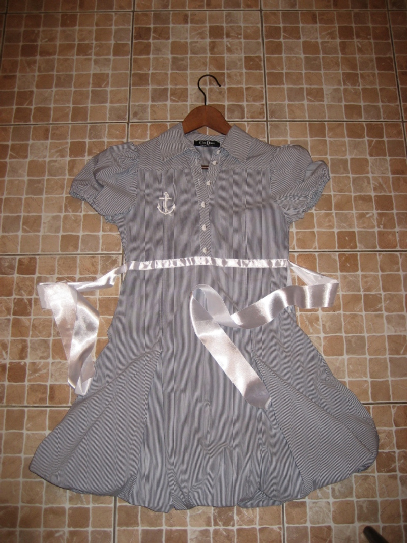 платье в морском стиле (можно носить при не жестком дресс-коде в офис) размер 42 (можно 40-44) длина 88 см., талия 70 см. (сзади поясок, талия чуть-чуть завышена, что визуально удлиняет ноги при таком фасоне не делая вас чуть-чуть беременной, юбка на подъбнике-тульпан с кляньями, сбоку плательный замок. Б-у пару раз, цена 650 руб.