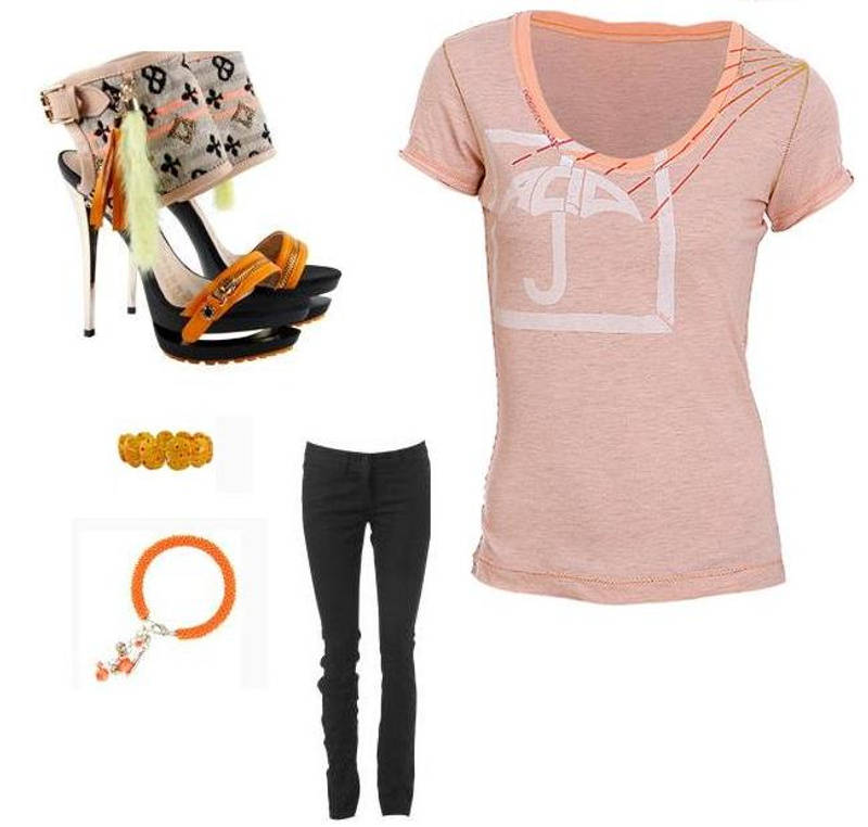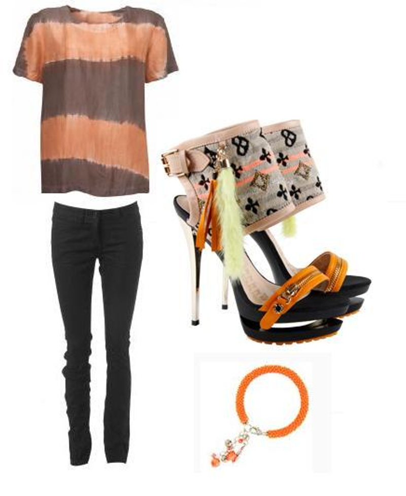 Босоножки конечно специфические, думаю с ними платья юбку не стоит одевать, а вот с черными дижнсами скини и какой нить нейтральный верх в цвете похожем, что присутсвует на самих босоножках, можно одеть. Каблук 14 см -это конечно что то%), хотя если у вас рост не большой, то будет норм. Вот мне кажестя с этим можно сочетать. На первом фото футболка TopShop кажется.