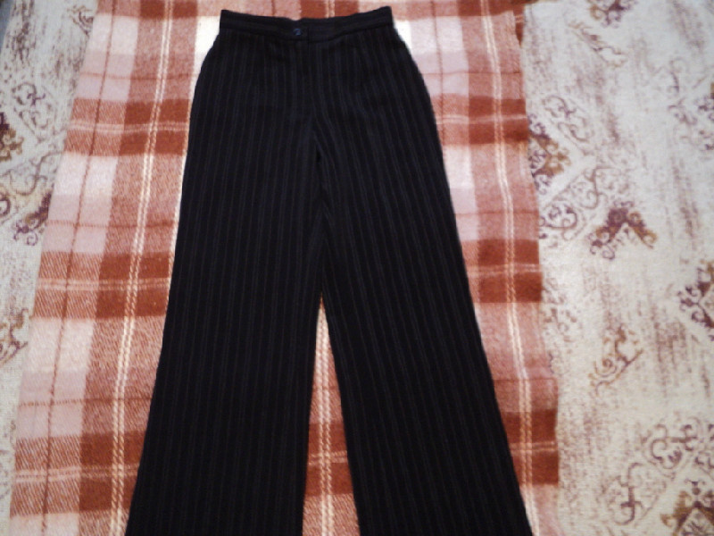 Черные брюки.Первые клешеные со стрелками и отворотами (плотная, но легкая ткань), вторые из плотного материала в тонкую , незаметно-белую полоску, прямые. Р-р. 42-44. По 150 руб. Связь в личку. Как показала примерка, мерять и носить надо клёши с небольшим каблуком (они на ростовку 160-165 максимум)