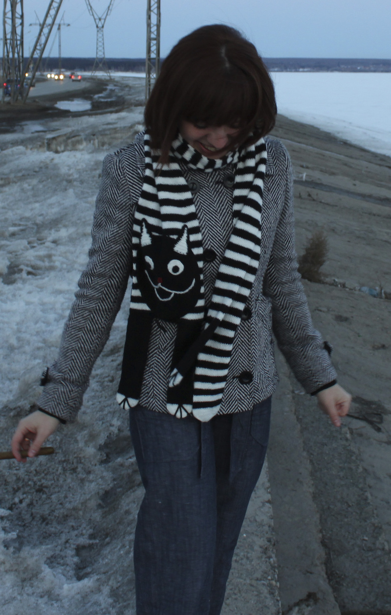 , а, во-вторых, именно на этом фото у тебя аксессуары подобраны - и шарфик, и очки, и колготки в тон к шарфу. Так что давай показывай фото с джинсами, а там посмотрим