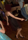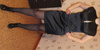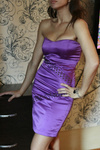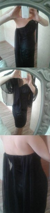 4. Платье с открыми плечами,черное, в фиолетово-серую полоску. Есть съемные лямки. Атласное. Очень стройнит. Прекрасно смотрится с болеро. Цена 500 руб.