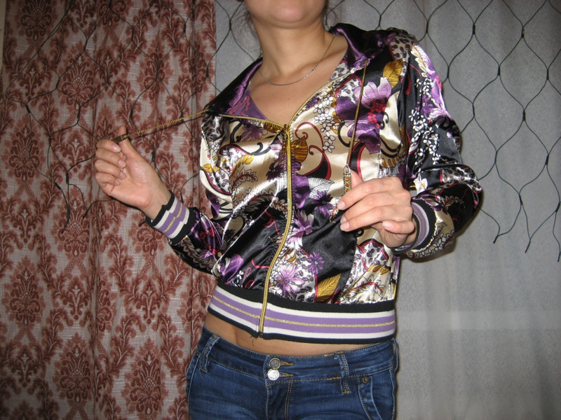 Атласная кофточка на замке, «собачки» украшены стразами, резинка с люрексом, смотрится просто шикарно, сделано в Турции, не пришлось поносить, этикеток нет, размер 40-44, цена 1000 руб.