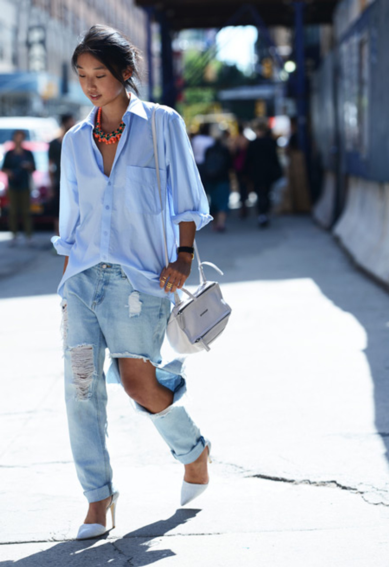 Вот такие мелочи все и убивают - могло получиться модно и трендово, а получилось - как будто с чужого плеча здоровенные штанищи, и ноги сразу огрубели, смотрятся колодами. В таких бойфрендах - вся фишка в контрасте с тонкими, хрупкими обнаженными щиколотками, ну еще некоторые рубашку расстегивают и показывают хрупкий же животик в маечке...
