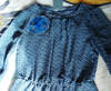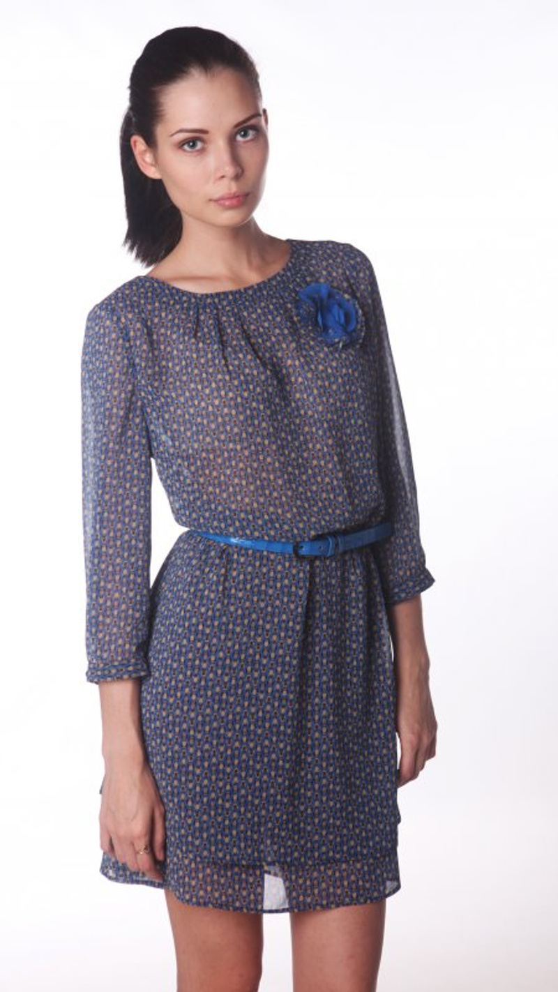 Креп блузочный (100% п/э), цвет синий, принт "кресла". Платье прямого силуэта с резинкой по линии бедер (чуть ниже талии), двойной подол. Рукав 3/4, на пуговицах с фирменным тиснением. Платье без застежки. Длина - 90см. Ремень в комплект не входил.