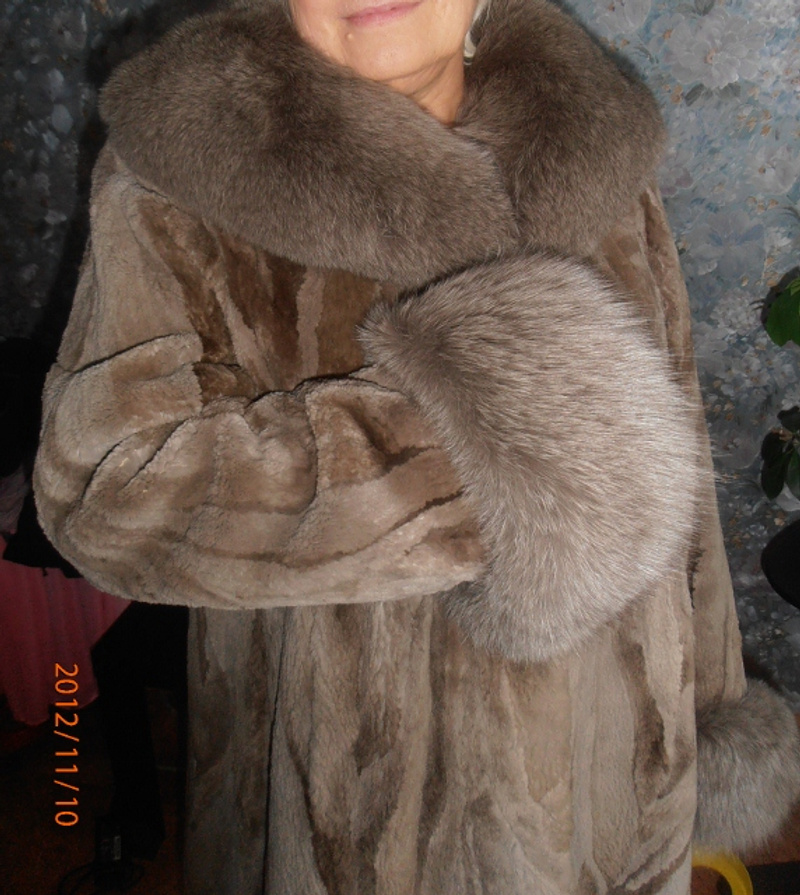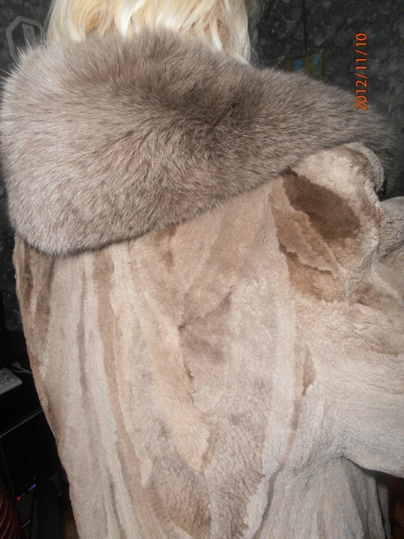 Очень тёплая шубка! Стриженый кролик, мех смотрится дорого, очень качественная выделка.Состояние очень хорошее!Одна небольшая потёртость в районе кармана. Можно легко убрать. Воротник и манжеты- густой, пушистый песец. Размер 42-44, рост примерно 164-170.