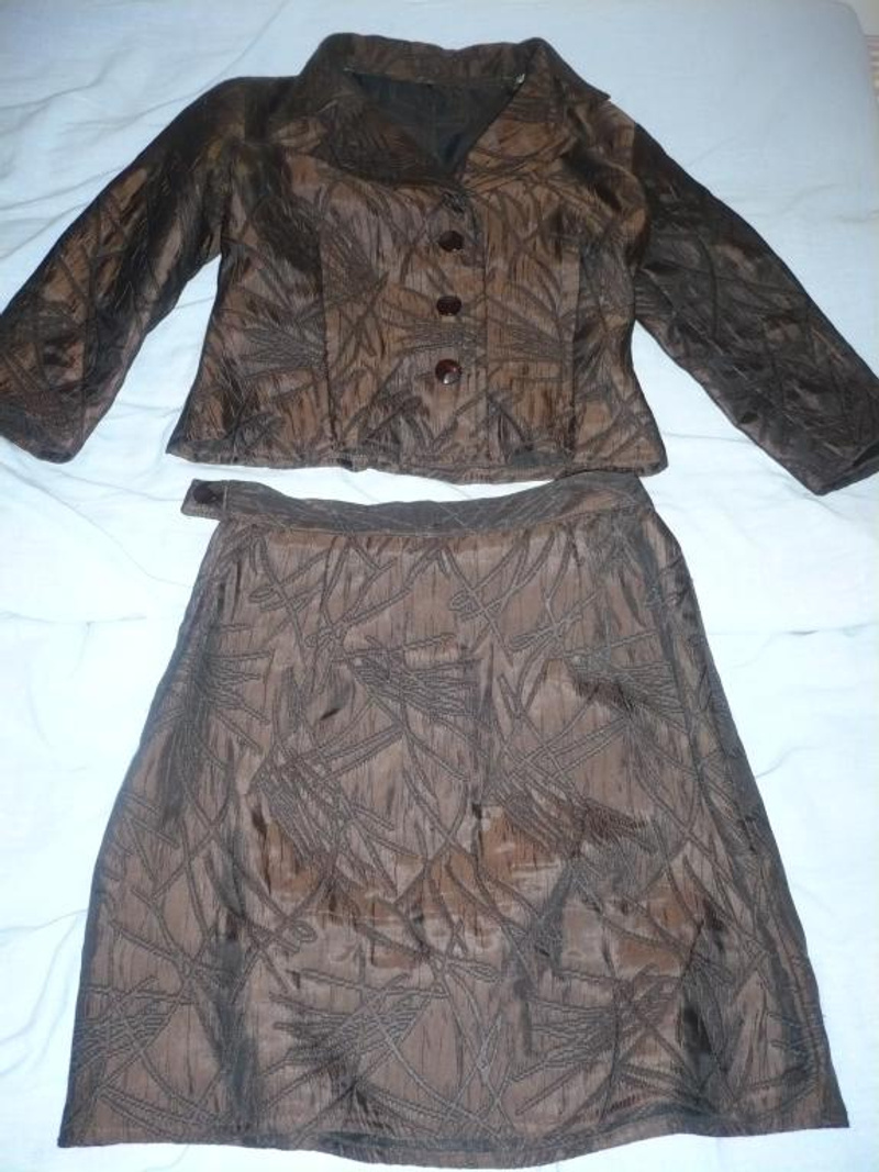 1. Костюм (Брюки, жилетка, пиджак удлиненный и юбка). Цвет темно-зеленый. Мне большеват, размер 42-44. Фото 1-3. 1000р торг.
