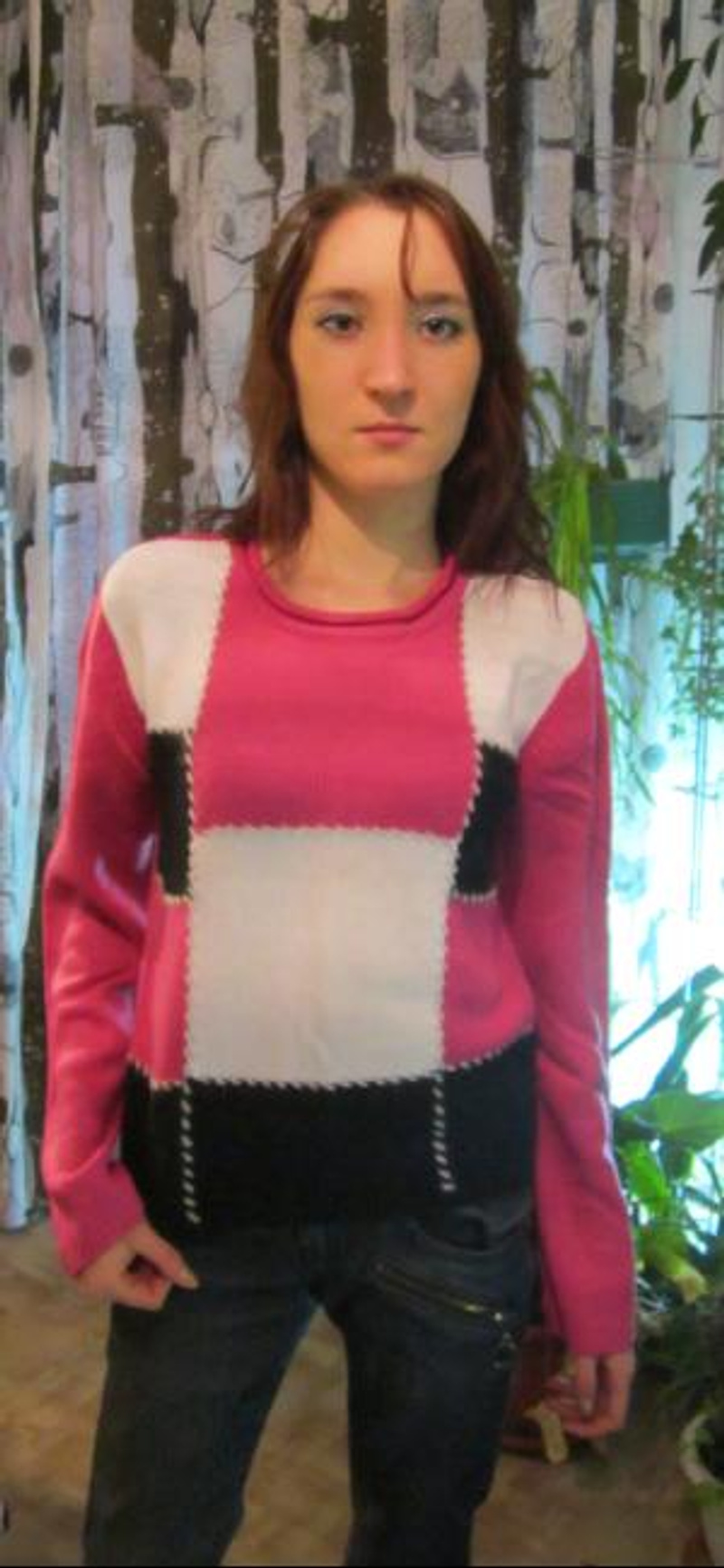 4. Кофта розовая с квадратами. Рукая расклешен. Размер 40-42. 250р.