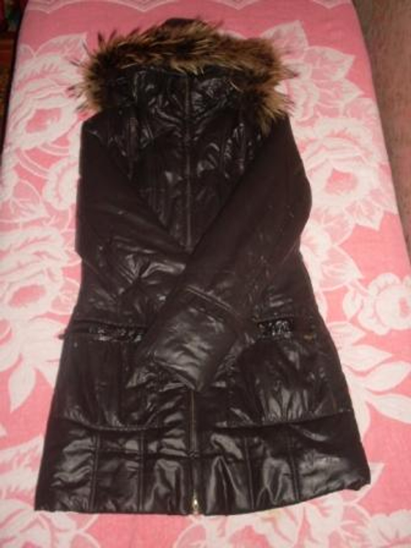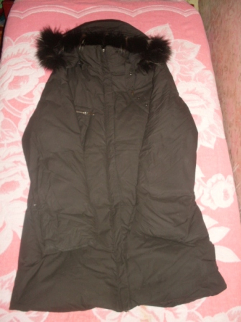 4) пуховое пальто Aviva, с меховым воротником, очень удобное, в оч. хорошем состоянии, пух не лезет, разм. 42, 500 руб.