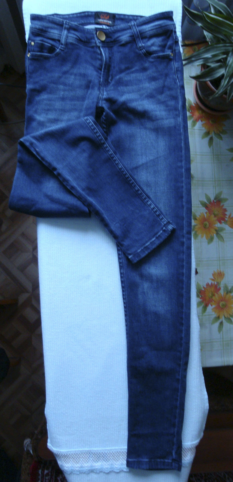 Замеры: талия 36 см, бедра 49 см, длина по шву с внутренней стороны 78 см, общая длина с талии и до конца штанины - 103 см.Ширина штанины 20 см на конце.Средняя посадка