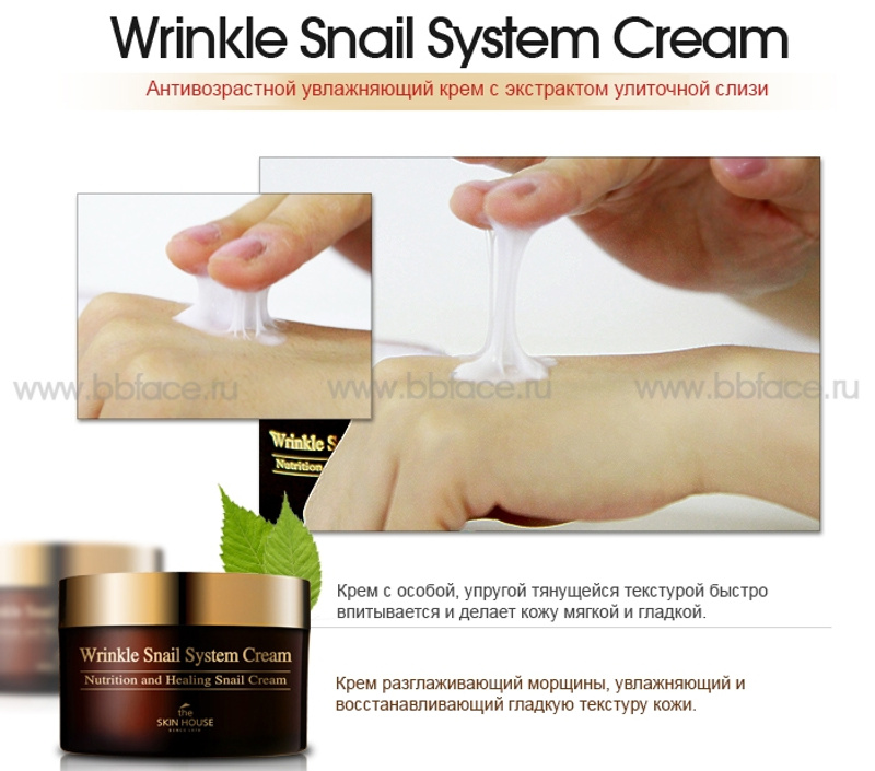Крем, содержит 92% экстракта улитки. Кожа со временем теряет упругость и эластичность, чтобы избежать преждевременного старения, ее нужно постоянно подпитывать. Многофункциональный крем Wrinkle Snail System Cream состоит из веществ необходимых коже -мощная природная гликолевая кислота в комбинации с аллантоином, белками, эластином и коллагеном в естественной форме с биологическими компонентами, совпадающими с компонентами, содержащимися в коже человека. Кожа признает эти вещества как свои собственные и использует их, поддерживая способность восстановить себя без риска передозировки. Не вызывает привыкания. Крем питает, сохраняя влагу в коже. Борется с процессом старения. Интенсивное обновление и восстановление при следующих проблемах: морщины, акне, расширенные поры, угревая сыпь, послеродовая пигментация, возрастные пятна, шрамы после операций.