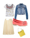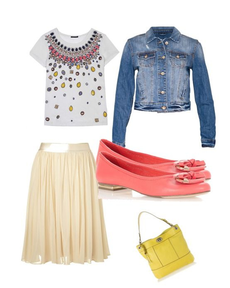 вот вариант повседневного образа для этой юбки. Я писала о светлом верхе-имела ввиду такую гамму. Без черного, синего и прочих тёмных цветов.